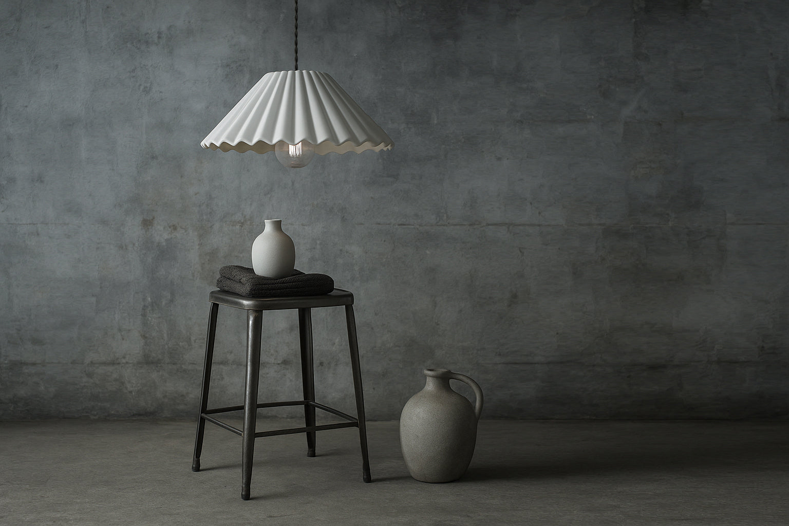 Crafted from porcelain, with meticulous attention to detail, this shade captures the essence of rugged mountain ranges and the organic flow of natural landscapes. Each fold is carefully sculpted to resemble the peaks and valleys while the interplay of light and shadow further enhance the ever-changing moods of the mountains.